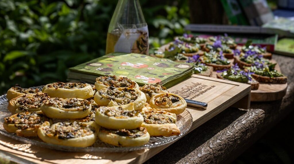 Literatur-Empfehlungen und lecker Wildkräuter – egal ob aus Vollkornbrot oder Blätterteig – die essbaren Wildpflanzen haben gerade Hochsaison. in dem kleinen Topf oben rechts finden sich ein paar junge Maiglöckchen.