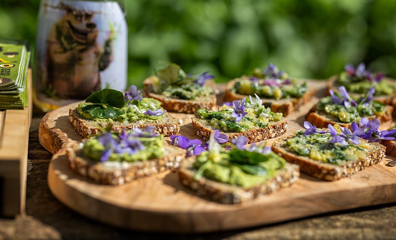 Es ist angerichtet – Bärlauchhummus und Pesto – garniert mit ein paar wenigen essbaren Blüten, auf Chiasamen- und Kartoffelbrot – und wer wollte probierte noch den Bärlauchlikör.