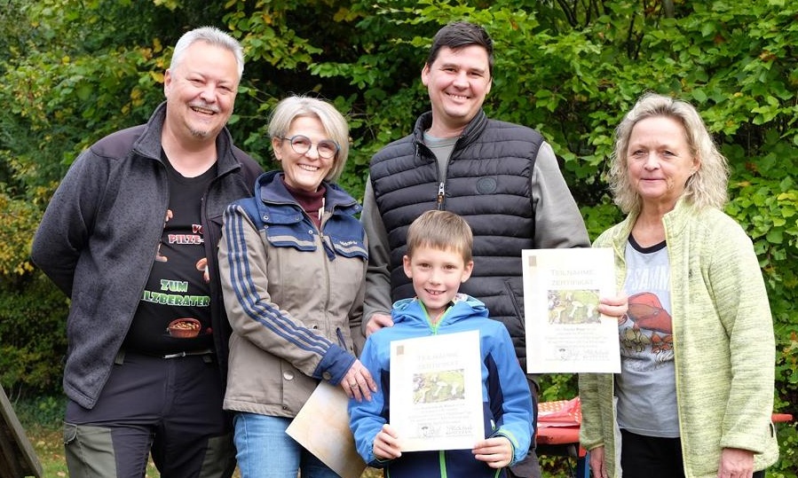 Louis mit Papa und Omi – natürlich erhielt er nicht nur eine Teilnahmebestätigung sondern auch eine Urkunde zum „PilzCoach Kid“ der DGfM und ein paar tolle Geschenke – wie das Pilzbuch „Pilze zum Genießen“ von Rita Lüder.