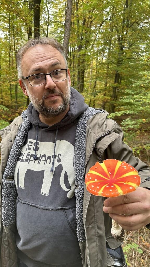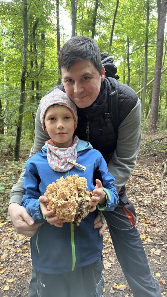 Was ist das für einer fragt sich Christos? 😉 Nicht ganz ernst zu nehmen – bei den Knollenblätterpilzen gehört die abziehbare Huthaut mit zu den Merkmalen – als Muster diente hier unser Fliegenpilz. Klasse – Sascha und Louis fanden ein tolle Krause Glucke für unser gemeinschaftliches Abendessen.