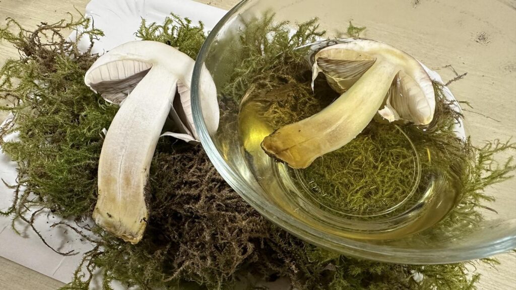 Auch fanden wir verschiedene Champignonarten wie Waldchampignons und Anisegerlinge – hier „entlarven“ wir gerade einen Karbolegerling mit kochendem Wasser. Diesen Schnelltest erfand ich vor vielen Jahren und er ist für Jeden einfach nachvollziehbar.