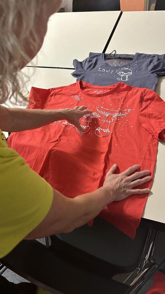 Moni erklärt und malte mit Louis für seine PilzCoach Kid Ausbildung ein T-Shirt – es wird Abend im Naturfreundehaus.