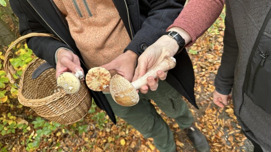 Sie haben genau richtig gelesen – wer Pilze sammeln möchte sollte erst mal die giftigen Arten kennenlernen – dieses Spezial-WE ist darauf ausgelegt, giftige Pilze genau kennenzulernen und sie mit essbaren Arten zu vergleichen. Im Bild oben vergleichen Teilnehmende den Pantherpilz mit Perlpilzen auf der Praxis-Lehrwanderung.