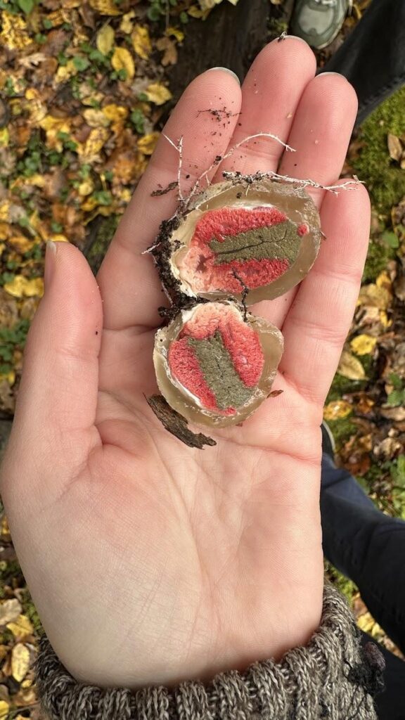 „Was mieft denn da“? Der Zuwanderer in unserem Wald wurde schnell entlarvt – der Tintenfischpilz stammt eigentlich aus der Gegend um Australien – auch diesen Verwandten der einheimischen Stinkmorchel konnten wir heute finden und bestaunen.