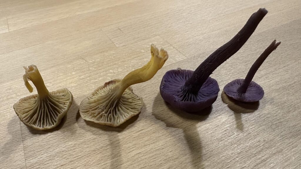 Gelbe und lila Pilzchen machten sich toll in unserem Abendessen – hier Trompetenpfifferlinge und lila Lacktrichterlinge.